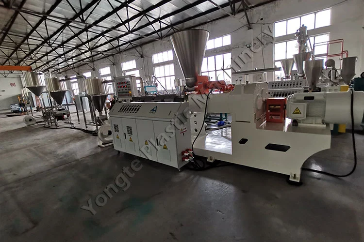 Noong 2024, nag-engineer kami ng custom na PVC compound pelletizing machine para sa isang Polish na kliyente, na partikular na idinisenyo para makagawa ng PVC masterbatch granules mula sa recycled PVC at CaCO₃ filler. Ang nilalaman ng tagapuno ng CaCO₃ ay maaaring madaling iakma sa pagitan ng 40% at 80% upang iayon sa mga detalye ng produksyon ng customer. Kabilang sa mga pangunahing bahagi ang isang awtomatikong feeder, isang SJSZ80/156 conical twin-screw extruder (75kW motor na may ABB frequency inverter, kumokonsumo ng ~50KW sa panahon ng stable na operasyon), isang mainit na pelletizing die para sa pare-parehong pagputol ng butil, at isang 304 stainless steel na three-stage na mabilis na air cooling at conveying system. Nakakamit ng makina ang kapasidad ng produksyon na 300-400 kg/oras at itinayo para sa 24/7 na tuluy-tuloy na operasyon na may zero downtime. Walang putol ang pag-install, suportado ng expert team ni Yongte, na nagbigay ng end-to-end na tulong. Ang post-installation, on-site na pagsasanay ay nagbigay ng kapangyarihan sa mga tauhan ng kliyente na patakbuhin ang kagamitan nang mahusay, habang ang malayong teknikal na suporta sa pamamagitan ng paggabay sa video ay nagsisiguro ng agarang paglutas ng anumang mga isyu, na nagpapanatili ng walang patid na produksyon at pinakamataas na pagganap.