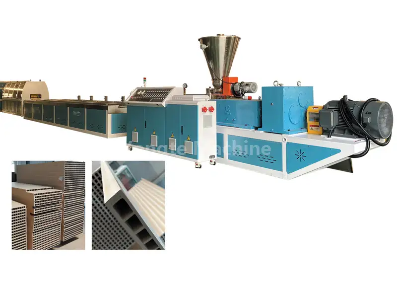 Ang espesyal na idinisenyong conical twin-screw extruder ay mahusay na makakapagdala ng wood flour at PVC resin mixtures, mabilis na gawing plasticize ang mga materyales upang maiwasan ang wood flour carbonization o PVC degradation, mapabuti ang produksyon na kahusayan at bawasan ang pagkonsumo ng enerhiya. Nilagyan ito ng servo motor para sa pagbabawas ng 15-20% power consumption, direct-drive vertical gearbox na may mataas na transmission efficiency at tumatakbo nang stably, matibay at energy-efficient automatic heating at temperature control system.
